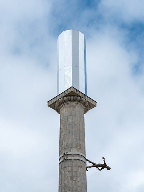Ce renversement est amplifié par l’illusion de disparition de la sculpture de Louis XVI, qui grâce à un jeu de miroirs, reflète le ciel environnant. Par ce geste, l’artiste colombien invite à réinterroger la présence des symboles monarchiques dans l’espace public. Il renoue aussi avec l’histoire de cette colonne, restée sans statue entre 1790 et 1823 pour cause d’instabilité politique, en associant au monument une effigie anonyme et déconcertante, à l’image de l’esprit décalé de la rue Maréchal-Joffre.