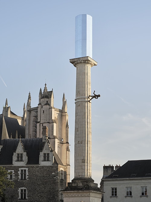 À Nantes, à chaque extrémité de la zone piétonne, deux silhouettes anonymes prennent d’assaut la façade d’un immeuble et la colonne Louis XVI en défiant toute logique gravitationnelle.